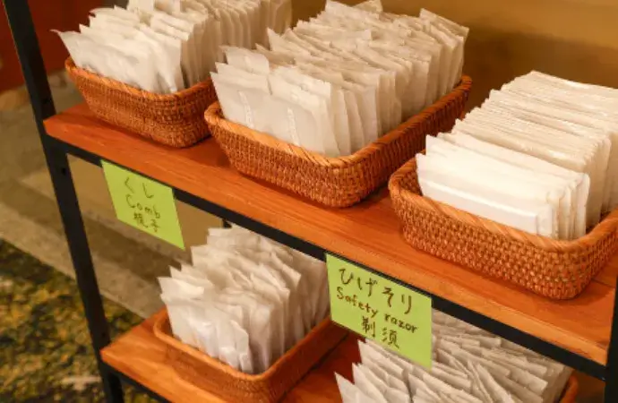 Towels・Yukata for going out / Yukata for sleeping / Haori (casual jacket)・Toothbrush set・Shampoo & Conditioner・Body soap & Hand soap・Shaving cream・Moisturizing lotion・Deodorizer・Tea set