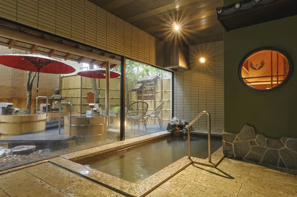 RyokufuThe large communal bath “Ryokufu” features a spacious indoor bath, a fragrant cypress tub, a cold-water bath, and the Kounotori Sauna. Among these, the open-air cypress tub is fitted with both hot spring and cold water spouts, allowing you to adjust the bath to your preferred temperature.