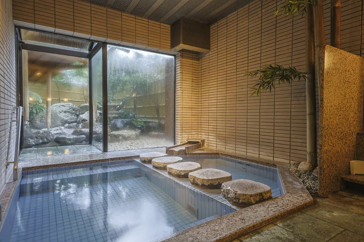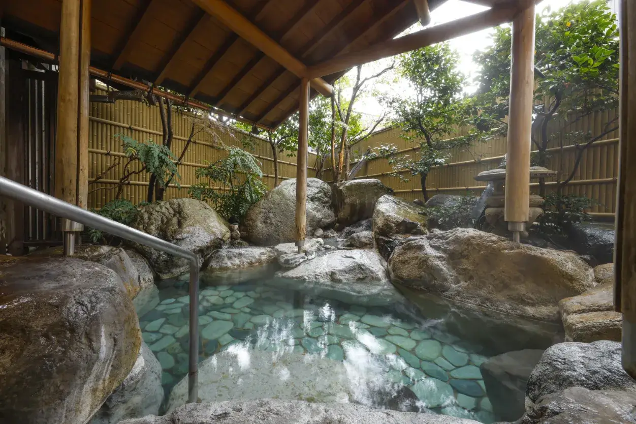 SuifuThe large communal bath “Suifu” features an indoor bath with a stepping-stone design, an open-air rock bath, and the Genbu Sauna. After your sauna session, cool down in the deep cold-water bath with an overhead shower.