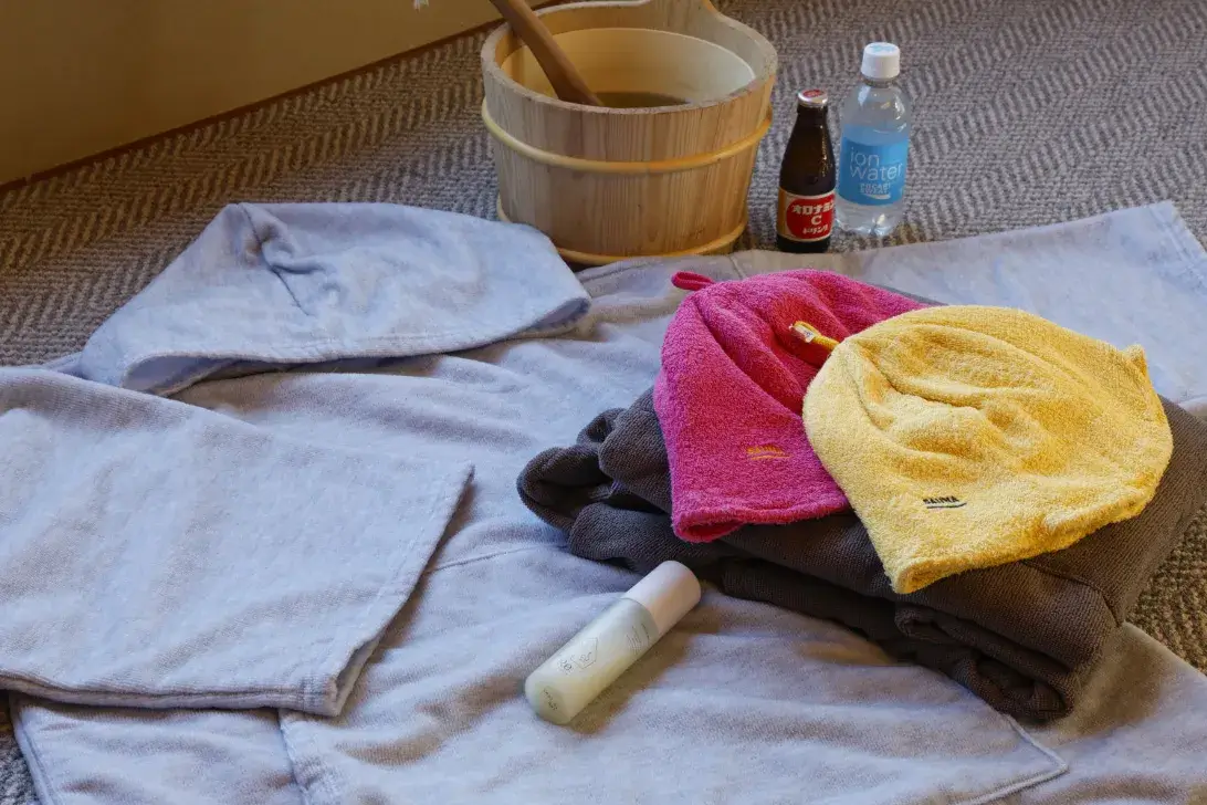 Sauna amenities such as sauna hats and ponchos are also thoughtfully prepared in your room.
